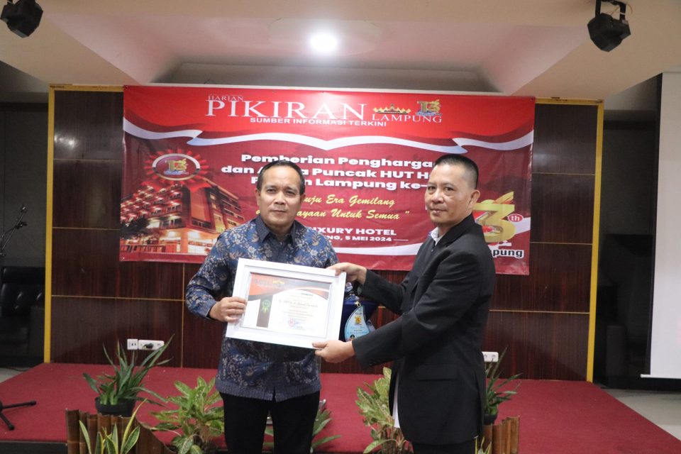 Penghargaan diserahkan langsung oleh CEO Pikiran Lampung Group Hersoli Riswan yang diterima Kepala Dinas Kominfotik Provinsi Lampung Achmad Saefulloh, mewakili Gubernur.