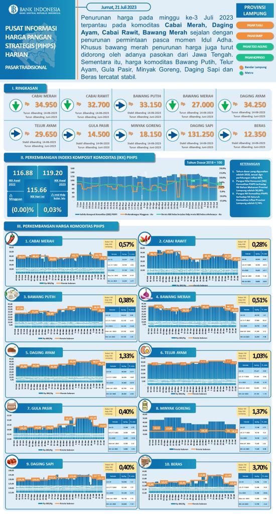 JESTV.ID – Penurunan harga pada minggu ketiga Juli 2023 terpantau pada komoditas cabai merah, daging ayam, cabai rawit, bawang merah sejalan dengan penurunan permintaan pasca momen Idul Adha.
