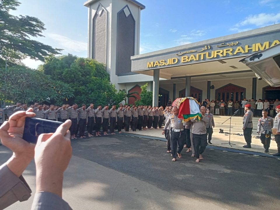 Upacara pemberangkatan jenazah menuju ke Pemakaman Bekasi dihadiri oleh para Pamen, Pama Polda Banten dan seluruh personel Ditreskrimsus Polda Banten.